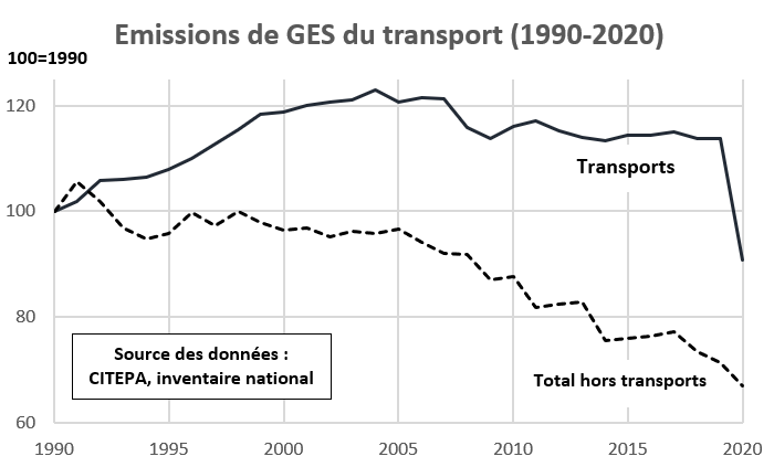 La publication cette semaine du rapport annuel du Haut Conseil sur le Climat et celle des données d’inventaire par le CITEPA (données SECTEN) sont l’occasion de revenir sur deux points : où en est le pays au regard des objectifs de réduction d’émission ? Comment évolue la composante transport qui en représente un bon tiers si on inclut les transports internationaux ?
