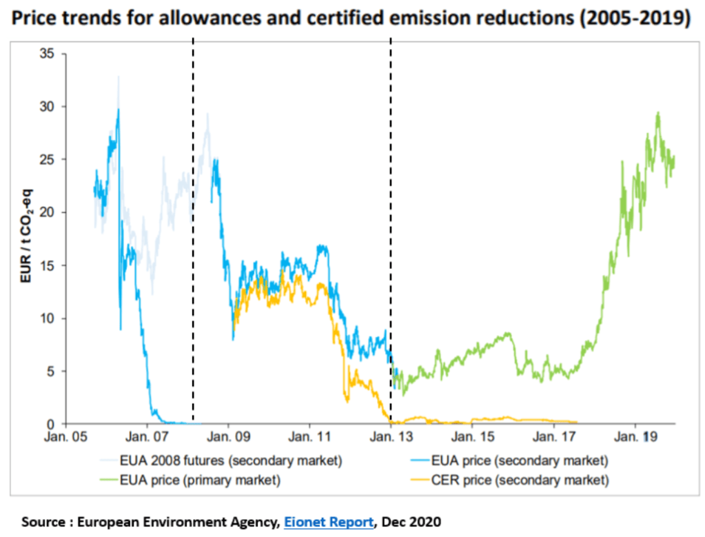 Lors de la phase de test du marché (2005-2007), la fixation du plafond a été réalisée de façon décentralisée, chaque État membre disposant d’une large autonomie, mais d’une information limitée sur l’historique des émissions usine par usine. Le résultat ne s’est pas fait attendre : les États ont pour la plupart servi généreusement leurs industriels. Beaucoup trop de quotas ont été distribués. Leur prix a rapidement tendu vers zéro !