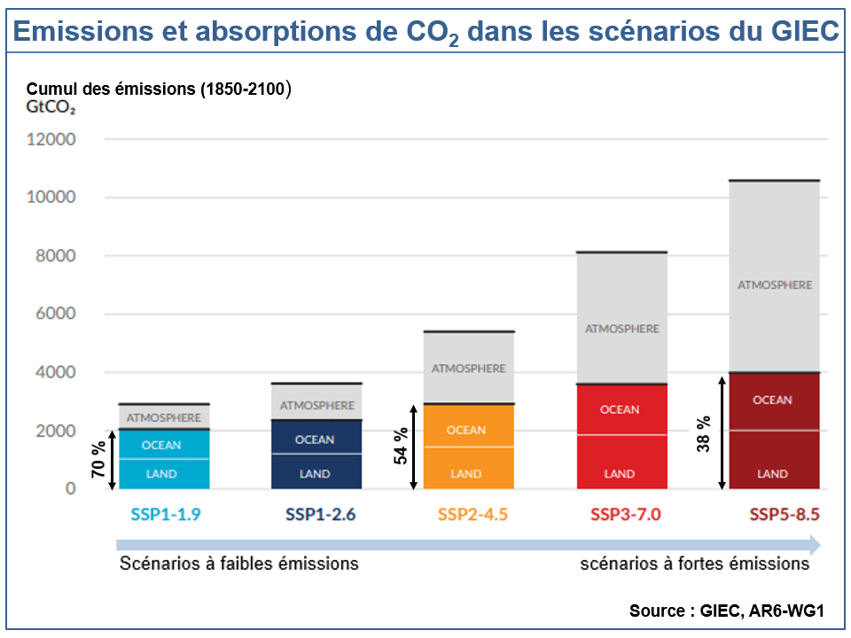 Le WG1 n’a pas détecté de variation claire de cette proportion durant les dernières décennies. Il alerte cependant sur la probable perte d’efficacité des puits de carbone durant les prochaines décennies à la suite du réchauffement. De ce fait, la proportion du CO2 absorbée par les puits naturels devrait fortement baisser dans les scénarios fortement émissifs (graphique).
