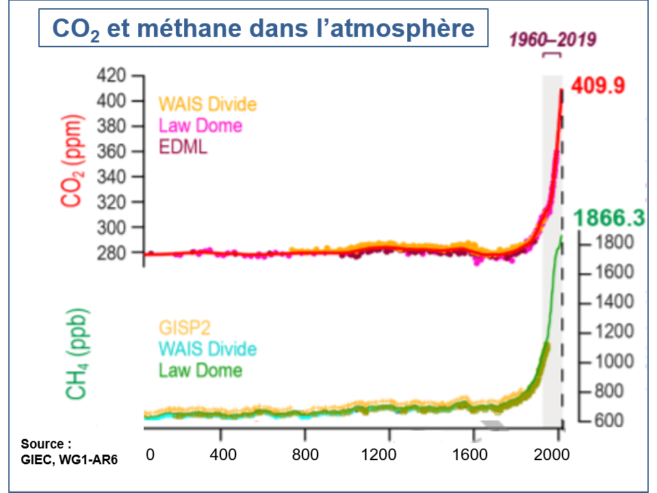 Le méthane stocké dans l’atmosphère à la suite des rejets humains exerce un effet de réchauffement un peu supérieur à 0,5°C. Cela équivaut à deux-tiers de l’impact du stock de CO2, ou encore à l’effet de refroidissement de l’ensemble des aérosols. Cela est du à l’augmentation de sa concentration par rapport à l’ère préindustrielle qui n’a rien à envier à celle du CO2.