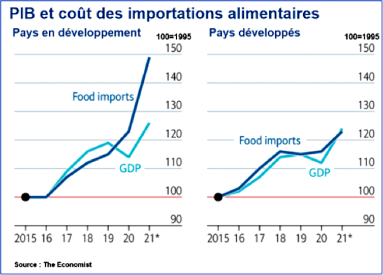 Il en va tout autrement dans les pays moins avancés où l’alimentation représente une composante bien plus importante du budget des familles. Dans ces pays, la « facture alimentaire » importée s’est accrue bien plus rapidement que le PIB. Au plan macroéconomique cela a fragilisé leur balance commerciale. Le choc des prix importés a lourdement frappé les ménages. Il aggrave l’insécurité alimentaire.