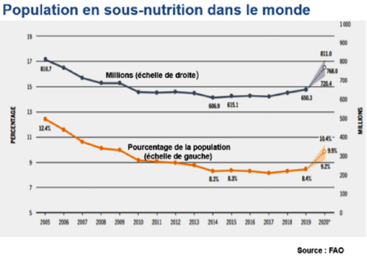 Depuis 10 ans, ces progrès sont interrompus. La FAO a observé une lente remontée du nombre de personnes souffrant de la faim à partir de 2015. Le déclenchement du Covid a aggravé les choses. En 2020, le nombre de personnes affectées par le fléau est probablement remonté aux alentours de 800 millions de personnes.