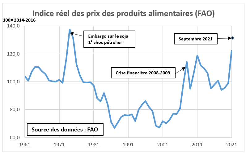 Exprimé en pouvoir d’achat relativement aux biens industriels, le prix de ces matières agricoles a dépassé les pics atteints au lendemain de la crise financière de 2008-2009. Il s’approche de son plus haut historique, atteint lors de la crise de 1973 lorsque les États-Unis avaient imposé leur embargo sur le soja et l’OPEP celui sur le pétrole.