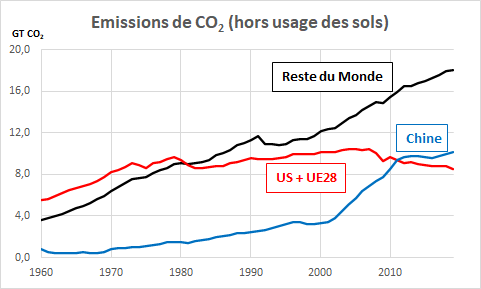 Si on cumule le poids des trois premiers émetteurs – Chine, Etats-Unis et Union Européenne à 28 – on constate que les trois ensembles représentent un peu plus de la moitié des émissions mondiales de CO2. Mais ce poids se réduit depuis maintenant une décennie.