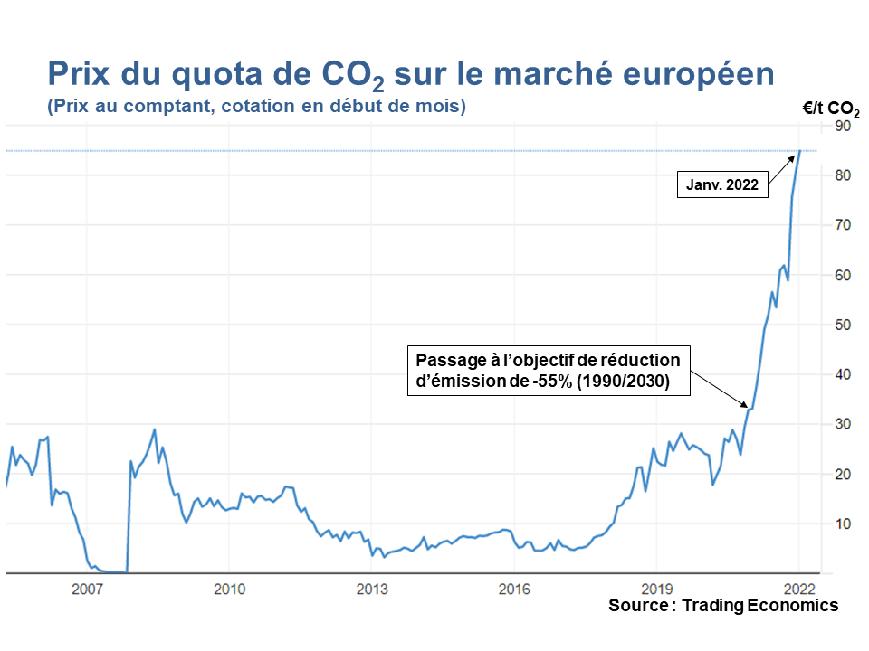 - Le rehaussement des objectifs de l’UE à -55%, adopté en décembre 2010, et inscrit dans le marbre avec le « Fit for 55 » de la Commission. C’est un tournant majeur dans la politique climat européenne. Voyez le prix du quota de CO2 !