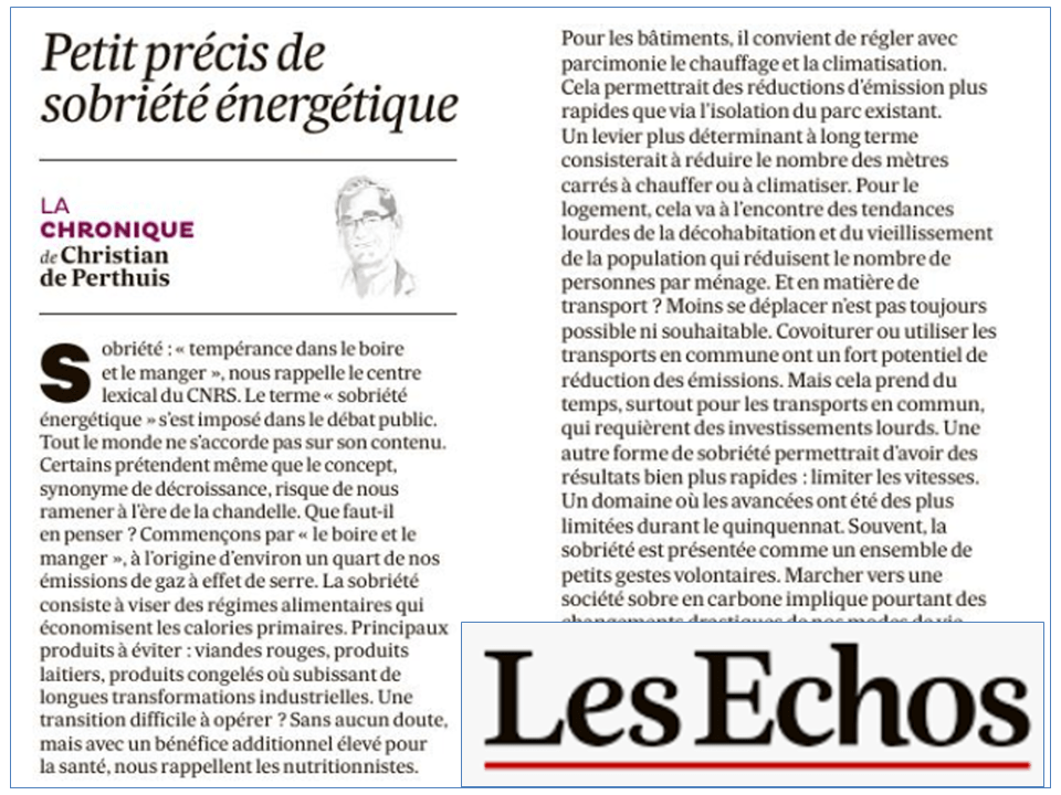 Chronique Les Echos – Sobriété : « tempérance dans le boire et le manger », nous rappelle le centre lexical du CNRS. Le terme « sobriété énergétique » s’est imposé dans le débat public. Tout le monde ne s’accorde pas sur son contenu. Certains prétendent même que le concept, synonyme de décroissance, risque de nous ramener à l’ère de la chandelle. Que faut-il en penser ?
