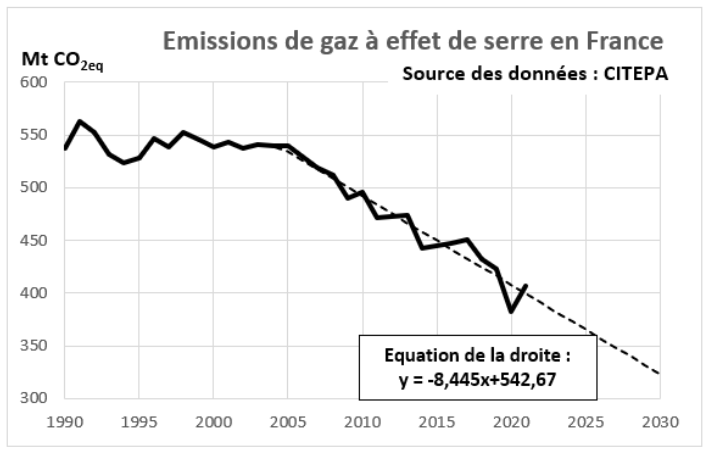 Au total, ces évolutions contrastées pourraient donner sur l’année 2022 des émissions voisines de celles de 2021. Un tel résultat ne serait pas bon. Il mettrait l’année 2022 au-dessus de la tendance de moyen terme observable depuis 2055. Or, cette tendance baissière n’est pas suffisante pour nous diriger vers l’objectif de réduction d’émission de 55 % à l’horizon 2030.