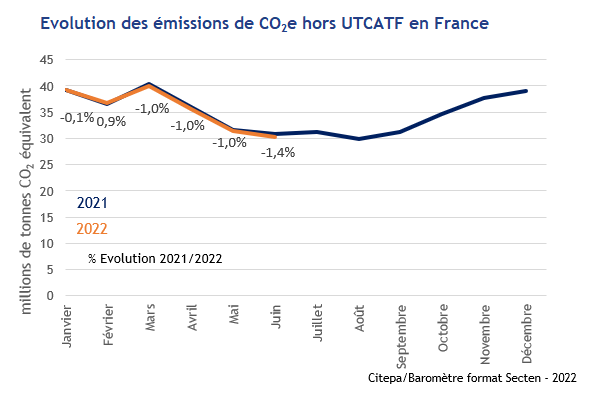 Le CITEPA vient de rendre publiques les données de son baromètre mensuel sur le second trimestre 2022 : tous secteurs et gaz confondus, les émissions brutes de gaz à effet de serre (hors changements d’usage des terres) sont en recul de 1,1% sur le second trimestre 2021, après une quasi-stabilité au premier trimestre. Sur les six premiers mois de l’année, le recul est de 0,6%.