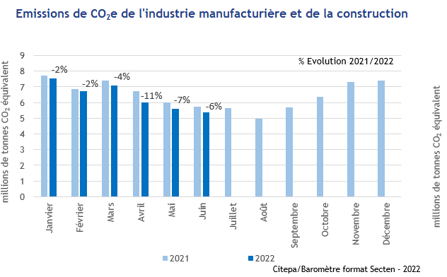 Industrie manufacturière ( 19 % des émissions). la baisse des émissions s’accélère au second trimestre avec un recul de 8% sur 2021 (-3 % au premier trimestre). La hausse du coût des énergies fossiles et le retournement de la conjoncture sont à l’origine de ce mouvement.