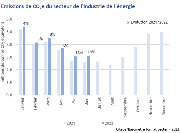 Secteur de l’énergie (11% des émissions nationale). A rebours des tendances de moyen terme, ce secteur connaît une forte reprise des émissions au premier semestre : +5% au premier trimestre et +12% au second. Cela résulte de la mise à l’arrêt de pratiquement la moitié des réacteurs nucléaires au second trimestre, dans un contexte où le déploiement des renouvelables a pris un retard considérable.
