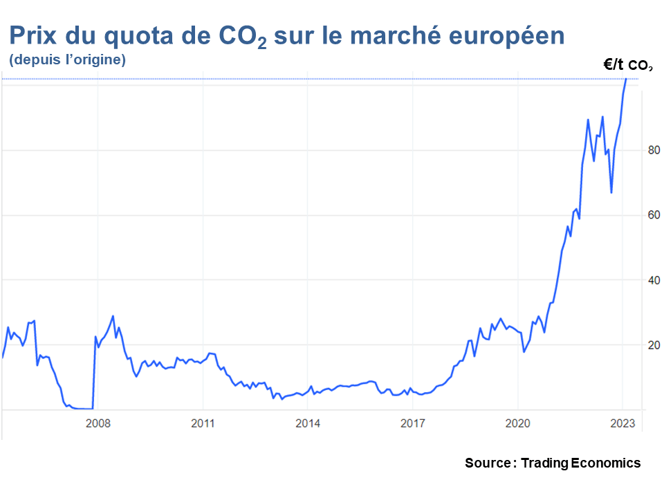 La Pologne avait proposé en 2022 de plafonner le prix du quota à 35 euros la tonne. La Hongrie avait même suggéré d’abandonner purement et simplement le système, à ses yeux une construction nuisible des technocrates bruxellois. En 2023, le doute est levé, et le prix du quota se porte bien. Il approche la barre symbolique de 100 euros. C’est une excellente nouvelle, car un tel niveau de prix accélère le rythme encore insuffisant de décarbonation de l’économie européenne.