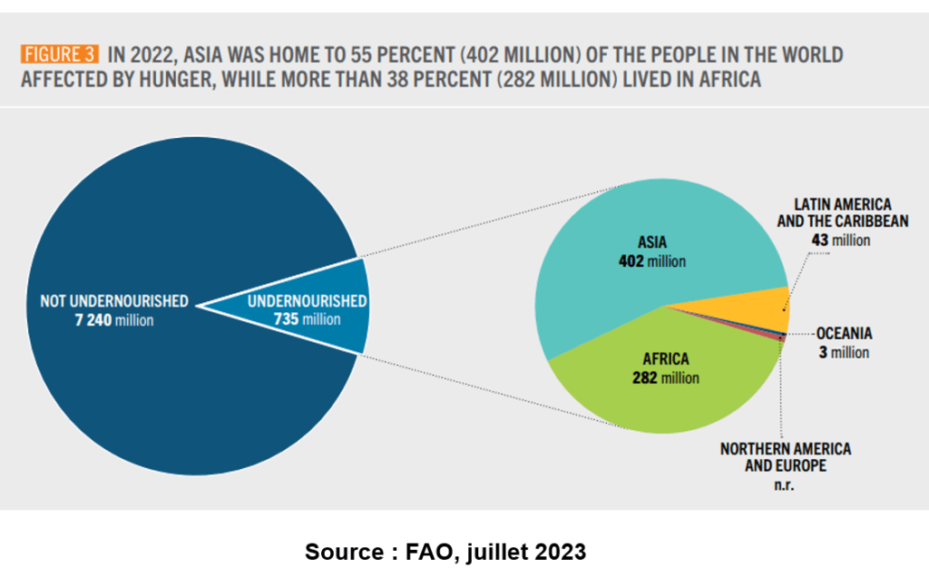 Si 55% des personnes en situation de sous-nutrition habitent en Asie, leur nombre diminue plus rapidement qu’ailleurs. En 2022, leur nombre a reculé d’un peu plus de 10 millions (sauf en Asie de l’Ouest où la situation s’est fortement aggravée en Afghanistan). En 2022, la FAO estime que 8,5 % des Asiatiques sont touchés par la faim.