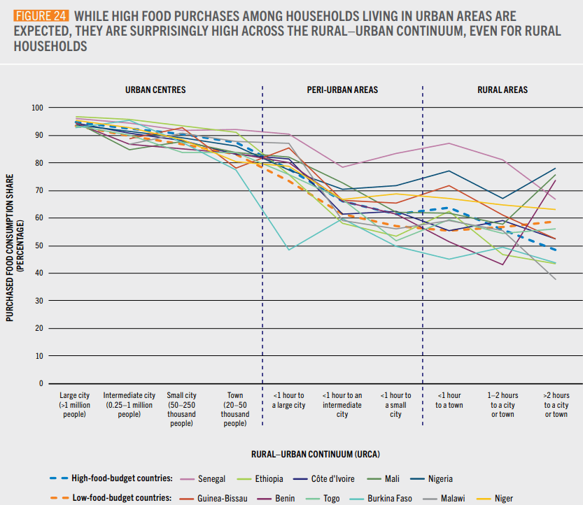 Le rapport de la FAO détaille le cas de 11 pays africains. Il révèle que la part de l’alimentation autoproduite est devenue minoritaire quelle que soit la localisation de la population. Dans les villes, les familles se procurent de 78 à 97 % de leur nourriture sur les marchés, l’autoproduction étant marginale. L’autoproduction est également devenue minoritaire dans les familles rurales où la majorité de la nourriture est désormais achetée, y-compris dans les zones les plus retirées. Au Sénégal, les familles rurales achètent par exemple de l’ordre de 80 % de leur nourriture, en Côte d’Ivoire, de l’ordre de 70%.