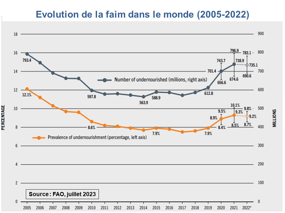 En 2022, la FAO estime que 935 millions de personnes ont souffert de la faim, soit 9,2% de la population mondiale. Ces chiffres sont des premières estimations, susceptibles d’être modifiées par la suite. Cette stabilisation fait suite à trois années de forte hausse. Par rapport à l’année 2019 qui a précédé le déclenchement de l’épidémie de COVID, la prévalence de la faim est passée de 7,9 à 9,2 % de la population mondiale. Ce sont 122 millions de personnes supplémentaires qui ont été affectées.