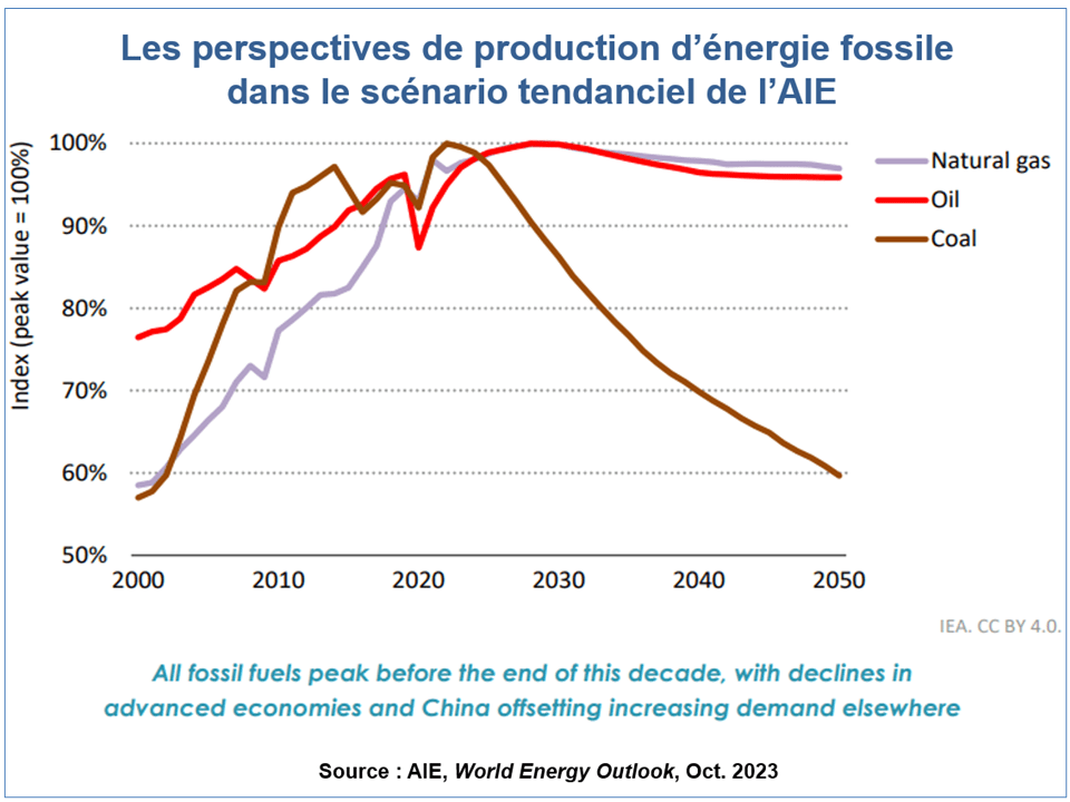Le désinvestissement du charbon a été amorcé depuis une vingtaine d’années dans les pays développés (à l’exception de l’Australie, qui a accru sa capacité d’exportation). Il est en train de gagner la Chine et pourrait toucher prochainement d’autres grands producteurs d’Asie (à l’exception de l’Inde). C’est ce qui conduit l’Agence internationale de l’énergie (AIE) à anticiper dans ses dernières perspectives un pic charbonnier imminent suivi d’un recul de 40 % de l’utilisation du charbon d’ici 2050, à politiques inchangées. Cela va dans le bon sens, mais n’est pas suffisant pour limiter le réchauffement en dessous de 2 °C.