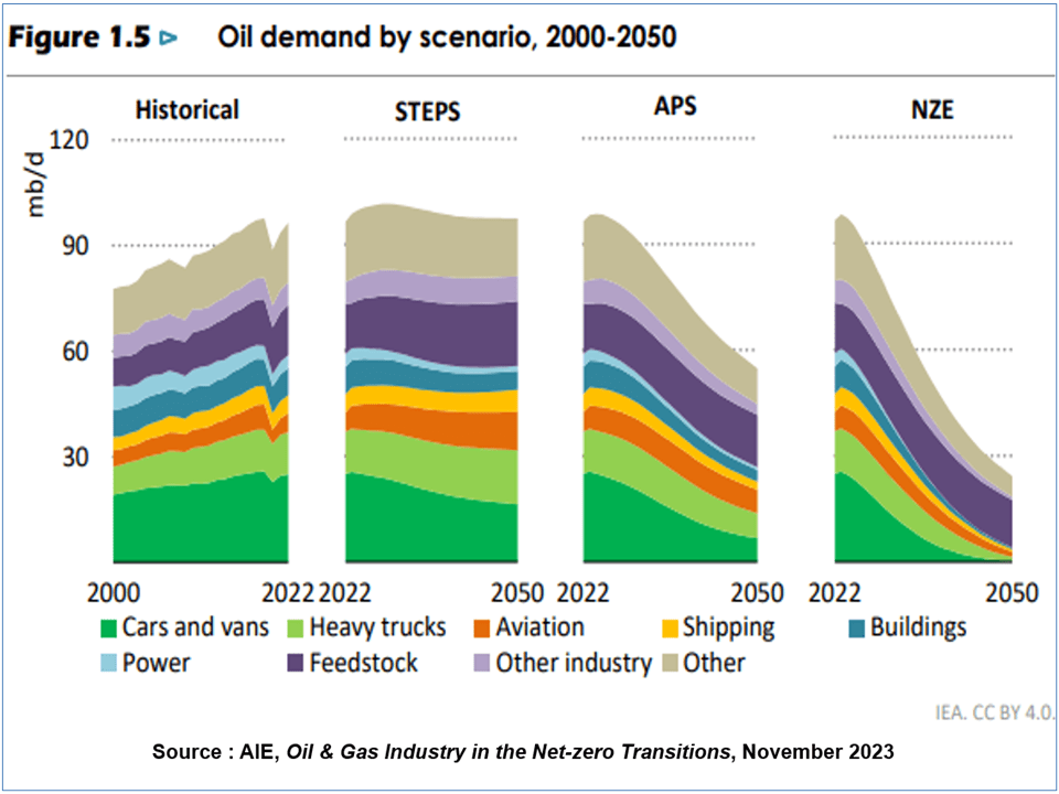 Pour viser 1,5°C (scénario NZE sur le graphique), il faut opérer des changements drastiques qui réduisent massivement l’usage du pétrole pour les transports de personnes et de marchandises, et réduisent, dans des proportions moindres ceux de la pétrochimie. Si on se situe dans ce scénario, il faut dès aujourd’hui cesser les investissements de capacités. Comme l’écrit le rapport : « No room for new fields ».
