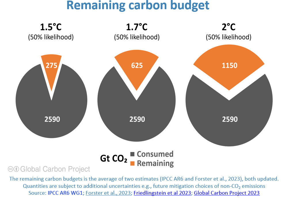L’édition 2023 du Global Carbon Budget permet d’actualiser les budgets carbone résiduels associés à différentes cibles de réchauffement moyen. Les montants absolus figurent sur le graphique ci-dessous. Ils représentent respectivement 7 années d’émission de 2023 pour 1,5°C, 15 années pour 1,7°C et 28 années pour 2°C.