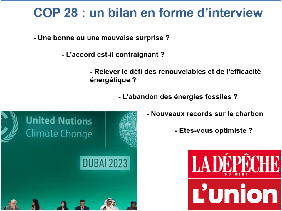 Interview parue dans la presse régionale. La COP 28 qui vient de s’achever a-t-elle été le théâtre d’un bon ou d’un mauvais accord ? Pour l’économiste Christian de Perthuis, créateur de la chaire d’économie du climat à l’université Paris-Dauphine, l’engagement pris de désinvestir des énergies fossiles est une excellente nouvelle. La marche vers une économie décarbonée est actée. Pour se réjouir véritablement, il conviendra toutefois, prévient-il, de ne pas négliger la traduction à venir de cet accord par chacun des pays signataires…