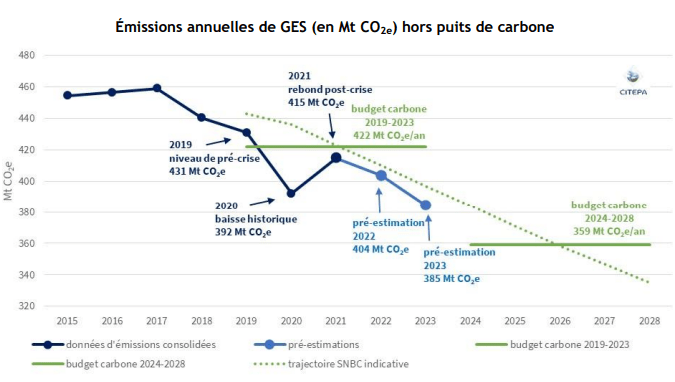 Le CITEPA a publié la semaine dernière les chiffres d’émission de gaz à effet de serre (GES) du 4ème trimestre 2023. Cela fournit une estimation provisoire des émissions annuelles à 385 Mt d’équivalents CO2 en 2023, soit -4,8% sur 2022.