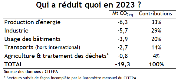 En 2023, les secteurs de la production d’énergie, de l’industrie et des bâtiments ont contribué à plus de 80% à la réduction des émissions. Celui des transports (à l’exclusion des transports internationaux) a également contribué à la baisse, mais dans une moindre mesure. Les chiffres sur l’agriculture et le traitement des déchets sont à considérer avec prudence, le baromètre mensuel du CITEPA ne permettant pas un suivi de leurs émissions comparable à celui des autres secteurs.