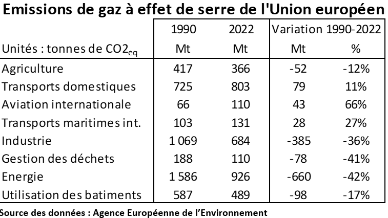Deux secteurs, la production d’énergie (électricité, chaleur, raffinage du pétrole) et l’industrie ont réalisé 80 % des réductions d’émissions (voir tableau ci-dessous). Ce sont les secteurs couverts par le système d’échange des quotas dont la réforme est un maillon essentiel du Pacte vert.