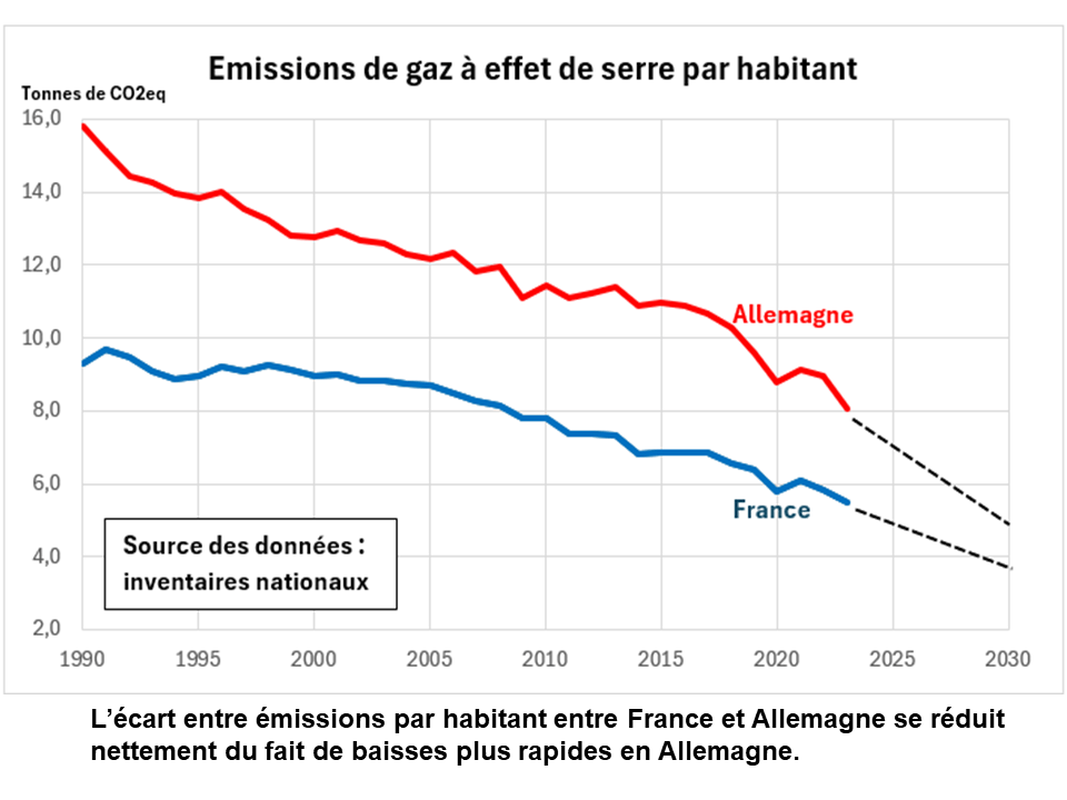 Examinons les faits. En 2023, l’Allemagne émet encore 8 tonnes équivalent CO2 par habitant, quand la France est descendue à 5,5 tonnes. L’écart provient principalement de la production d’électricité bien moins émettrice en France, où les trois-quarts du courant sont fournis par le parc nucléaire.