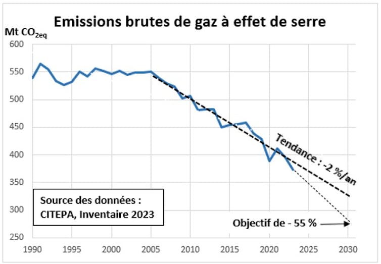 À l’instar de l’Union européenne (UE), la France s’est engagée à stabiliser sa dette climatique (objectif zéro émission nettes, ou de « neutralité carbone ») en 2050. Pour y parvenir, l’UE a fixé un objectif intermédiaire d’une réduction de 55 % des émissions nettes de gaz à effet de serre entre 1990 et 2030. C’est par rapport à cet objectif intermédiaire qu’il convient de jauger la soutenabilité de notre trajectoire d’émission.