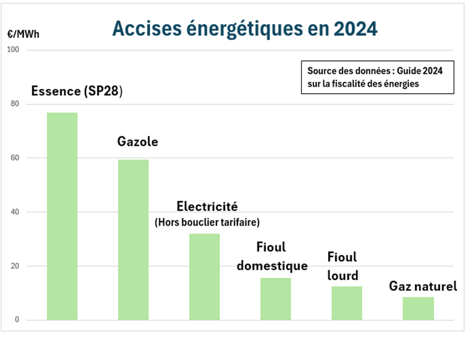 Les accises sont des droits assis sur le volume (gaz et pétrole), le poids (charbon) ou le contenu énergétique (électricité) des énergies consommées. La TVA s’applique également à ces accises. Les produits pétroliers composent un peu plus de 70% des accises. La faiblesse des accises sur le gaz s’explique par l’histoire : le législateur a détaxé le gaz dans les années 50 pour favoriser l’exploitation du gisement français de Lacq.