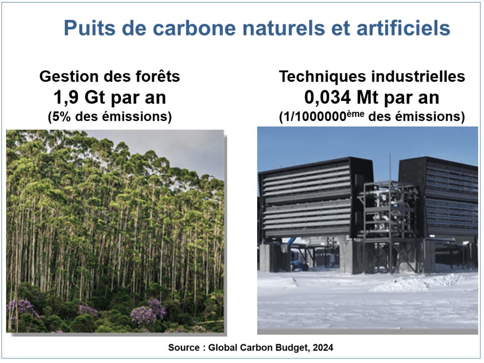 Pour terminer, observons une dernière figure, présentant la quantité de CO2 annuellement absorbée par la gestion des puits de carbone naturels (plantations forestières à titre principal) et les techniques industrielles de type capture directe : 5 % des émissions mondiales de CO2 pour les premiers, contre 1/1000000ème (un millionième) pour les seconds !