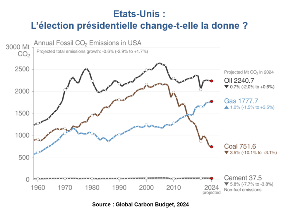 Concernant le charbon, le risque paraît minime. Il n’est plus rentable d’utiliser du charbon pour produire de l’électricité, même avec des centrales thermiques amorties situées à proximité des mines. La forte baisse des émissions liées à l’usage du charbon devrait se poursuivre. En 2024, Trump a du reste abandonné son slogan de la campagne 2016″Trump digs coal » pour la formule « Drill, baby, drill« .