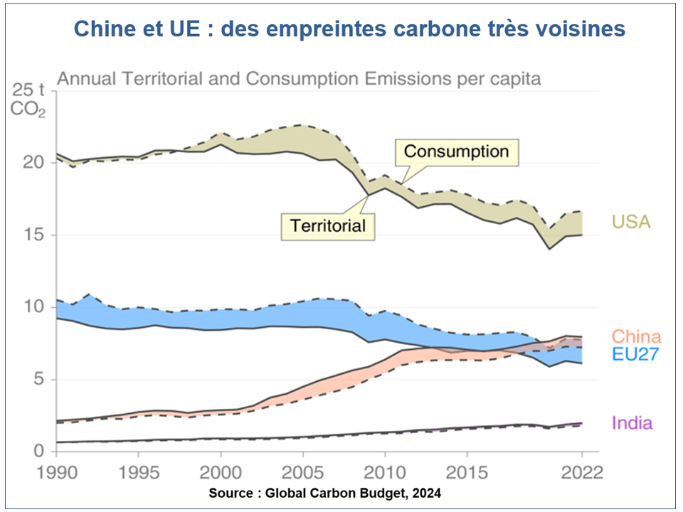 Sur la période récente, les émissions par habitant de l’UE sont passées en dessous de celles de la Chine et les empreintes de consommation sont désormais du même ordre de grandeur.