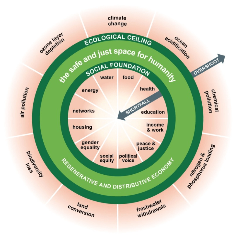 Ce binôme atténuation/adaptation pour le changement climatique s’inscrit bien dans la théorie du donut introduite par l’économiste britannique Kate Raworth. Pour Raworth, la résilience implique de respecter à la fois des plafonds et des planchers. L’économie doit veiller à ne pas dépasser les plafonds écologiques, autrement dit les seuils critiques fixés par la science en matière de climat, mais aussi de biodiversité, de cycle de l’azote et autres limites planétaires. Pour le climat, c’est le volet atténuation. Simultanément, l’économie doit assure les plancher assurant les besoins essentiels à la population. Parmi ces besoins, il y a l’accès à des milieux naturels sains, la lutte contre les pollutions locales et, bien sûr, la minimisation de la vulnérabilité face au durcissement des conditions climatiques, autrement dit, l’adaptation au changement climatique. L’économie du donut, avec ses plafonds écologiques et ses planchers sociaux est l’une des meilleures illustrations de l’économie verte, non bridée dans son fonctionnement, plus solidaire et résiliente face aux menaces environnementales globales.