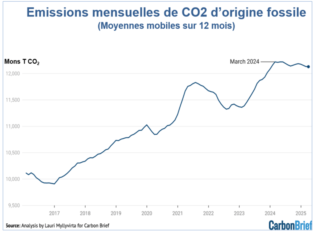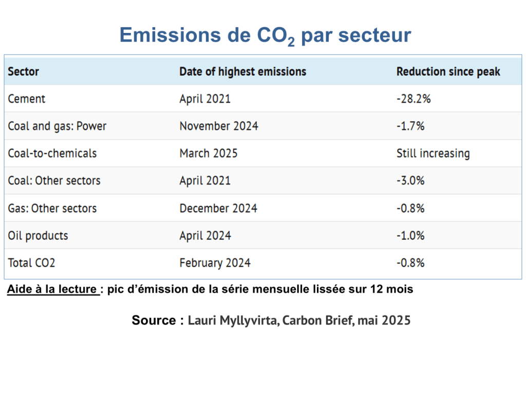 - les émissions chinoises de carbone fossile ont reculé de 1,4% au premier trimestre 2025 comparé au 1er trimestre 2024. Un fois gommé les fluctuations de court terme, ces émissions semblent avoir atteint leur pic en février-mars 2024 ;