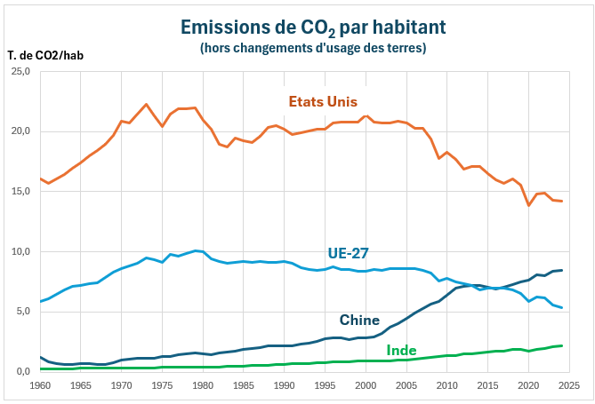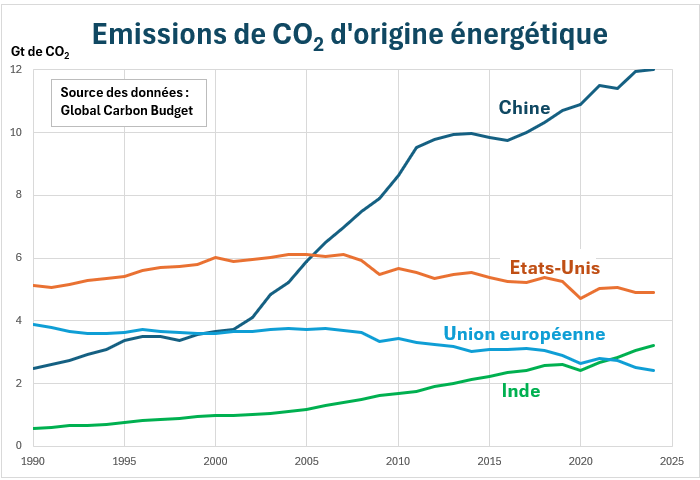 Tant qu’elles ont été maintenues sous l’éteignoir colonial, les économies asiatiques n’ont guère contribué au réchauffement planétaire : en 1950, l’Asie contribuait à hauteur de 6 % aux rejets mondiaux de carbone fossile. Leur émergence a totalement changé la donne : en 2024, l’Asie compte pour 56 % des émissions mondiales de CO2 d’origine fossile (production de ciment incluse). La Chine et l’Inde pour respectivement 32 et 9 %. De leurs décisions dépendra largement la possibilité, ou non, de passer le pic mondial des émissions durant la décennie 2020.