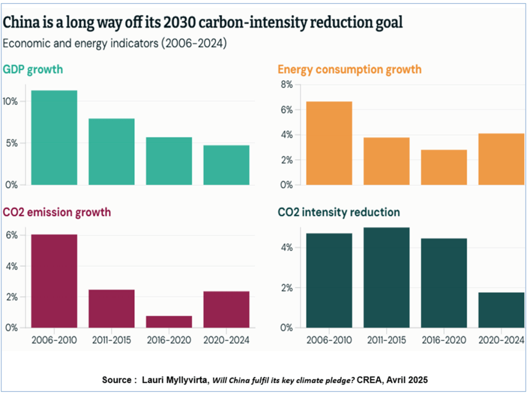 - Entre 2020 et 2024, le pays a en revanche pris du retard. Confronté aux effets en chaine de la crise immobilière, les autorités ont donné la priorité à l’extension des capacités industrielles permettant de moderniser l’économie et de chercher des débouchés à l’exportation. Le rythme de croissance s’est à peu près stabilisé, mais son intensité énergétique est reparti à la hausse, et avec elle les émissions de CO2. La Chine s’est alors éloigné de l’objectif d’une réduction de 65% de l’intensité carbone entre 2005 et 2030.
