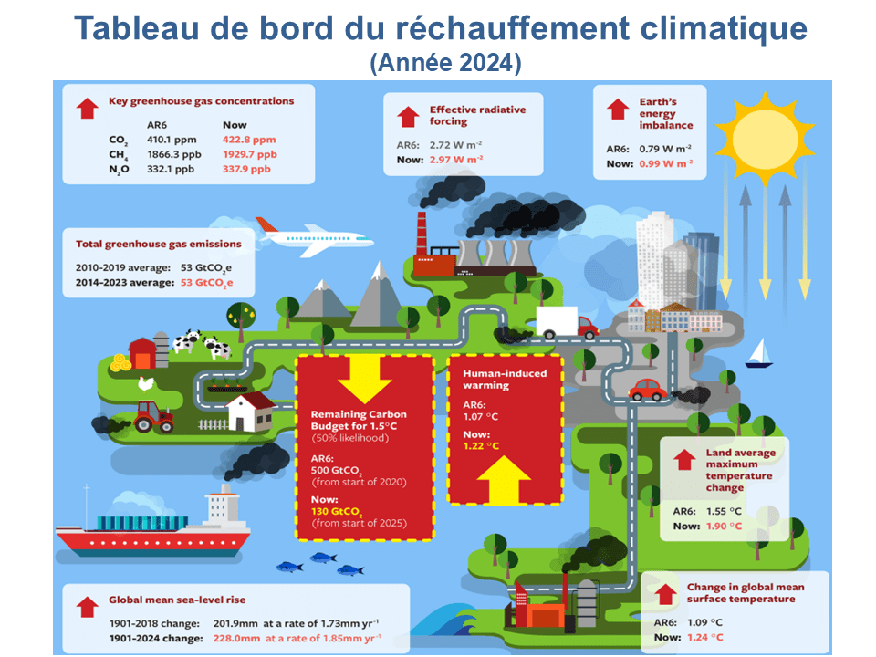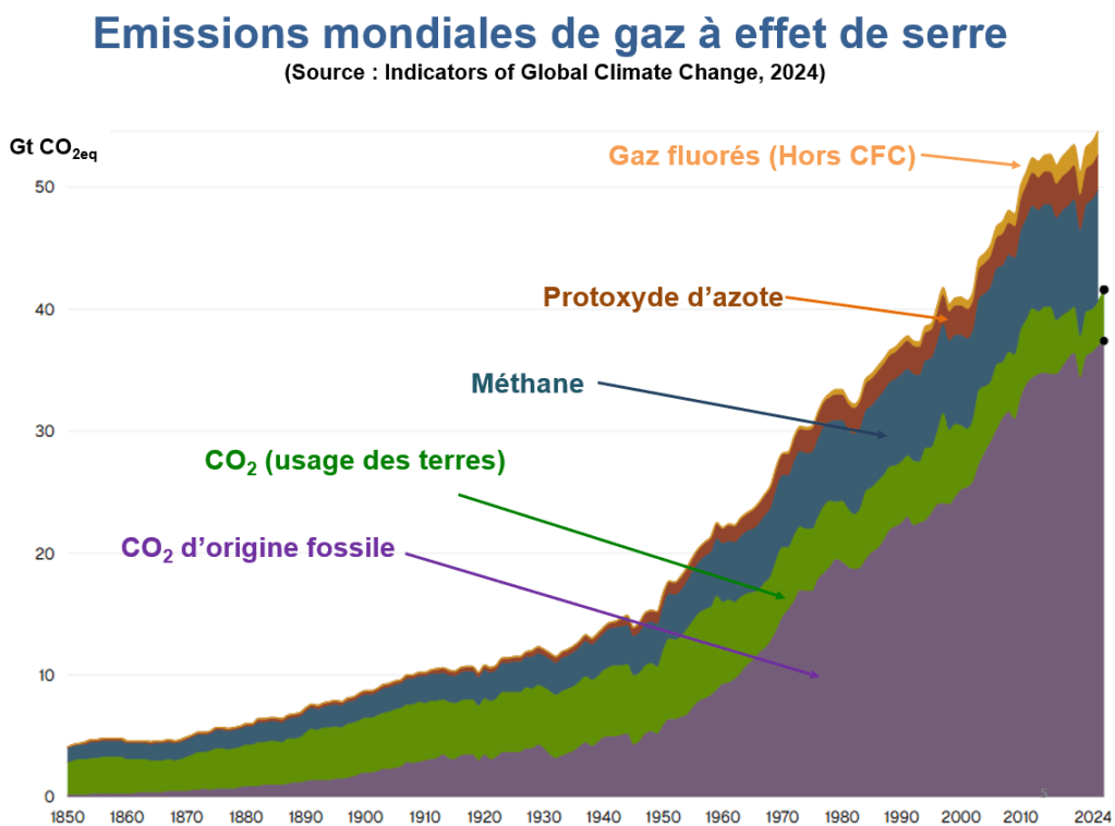 Ce ralentissement est insuffisant pour modérer la croissance du stock de GES dans l’atmosphère, dont le rythme se maintient, et s’est même accéléré pour le méthane depuis le début des années 2020. Or c’est ce stock qui est le moteur anthropique du réchauffement climatique. Ce moteur joue d’autant plus fortement que les rejets d’aérosols (principalement le SO2) refroidissant la planète se réduisent du fait du resserrement des contraintes sur les polluants locaux dans le transport maritime international et en Chine.