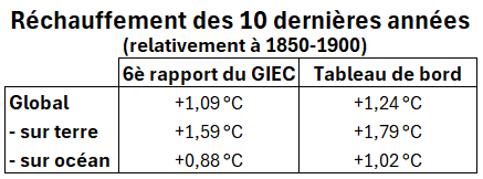 Le tableau de bord montre également l’impact de la réduction des rejets d’aérosols qui contribue au réchauffement : moins d’aérosols dans l’atmosphère, c’est moins de problèmes sanitaires à terre, mais aussi plus de réchauffement car les aérosols voilent le rayonnement solaire et agissent sur la formation des nuages. Cet impact est rapide. Les aérosols ne séjournant pas longtemps dans l’atmosphère, une réduction de leurs émissions se répercute rapidement sur le volume de leur stock dans l’atmosphère.