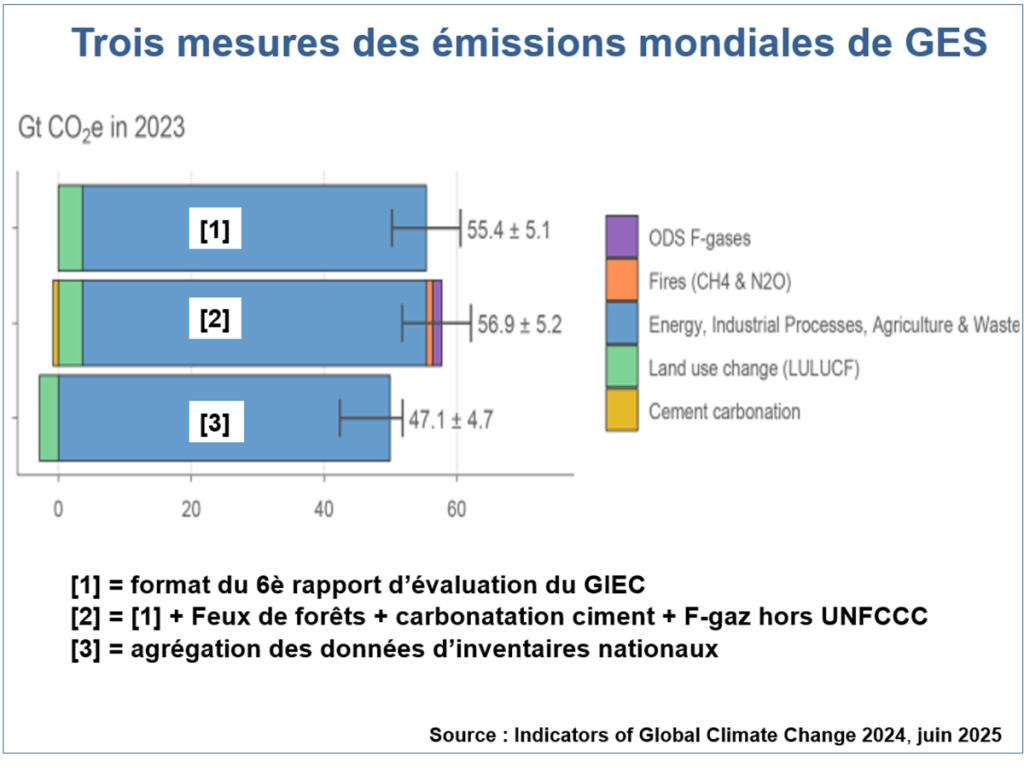 Dans la figure ci-dessus apparaissent trois façons de comptabiliser les émissions mondiales de GES. A 55,4 Gt d’équivalent CO2, le premier bâtonnet visualise les émissions de l’année 2023, calculées suivant les normes retenues par le GIEC . L’agrégation des données d’inventaires nationaux recueillies sur le site des Nations-Unies donne des émissions de seulement 47,1 Gt pour la même année. L’écart principal est à imputer à la façon de comptabiliser les émissions liées aux changements d’usage des terres, en particulier à la frontière retenue entre les émissions-absorptions d’origine anthropique et celles d’origine naturelle.