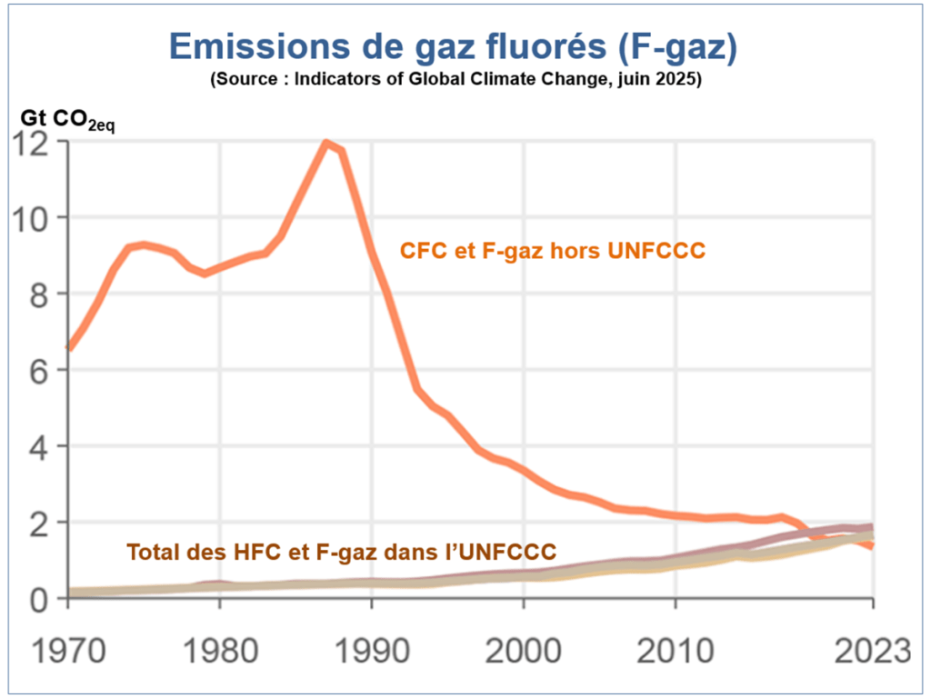Sur la période récente, les émissions de F-gaz répertoriées dans le cadre de l’UNFCC, dépasse celles de F-gaz dont la régulation a été mise en place par le protocole de Montréal (1987) destiné à protéger la couche d’ozone . Mais cette situation est relativement récente. Quand la lutte pour la protection de la couche d’ozone a démarré, les émissions de CFC et des autres F-gaz détruisant cette couche exerçaient un réchauffement équivalent à pratiquement 12 Gt de CO2, soit la moitié des émissions de carbone fossile de l’époque (22 Gt d’équivalent-CO2).