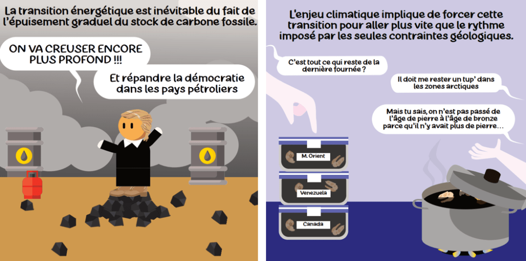 La transition vers d’autres sources d’énergie est donc inévitable à terme. L’enjeu climatique, c’est de réaliser cette transition bien plus rapidement que ne l’imposeraient les contraintes géologiques pour éviter les dégâts d’un réchauffement climatique supérieur à 1,5°/2°C.