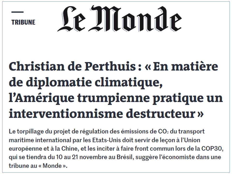 Il en va tout autrement cette fois-ci. En matière de diplomatie climatique, l’Amérique trumpienne ne s’est nullement mise en retrait. Elle pratique au contraire un interventionnisme destructeur, comme en témoigne le torpillage de la stratégie de décarbonation du transport maritime intervenu, à la mi-octobre, dans l’enceinte de l’Organisation maritime internationale (OMI).