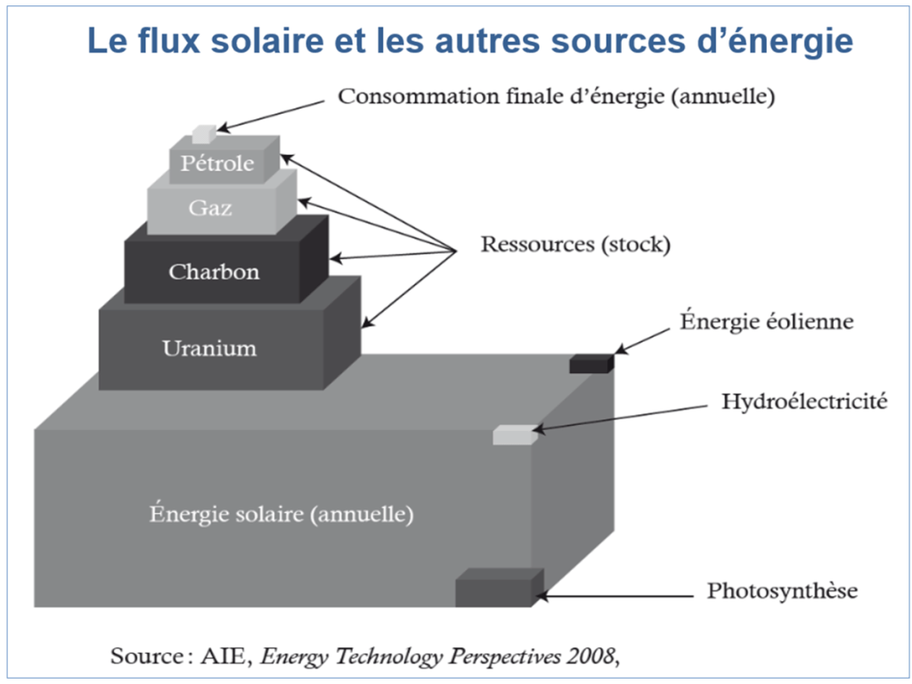 Pour sortir de l’addiction aux énergies fossiles, deux substituts décarbonés pouvaient candidater : la fission nucléaire à partir de l’uranium ; le captage direct de l’énergie présente dans le flux solaire et ses dérivés éoliens et hydrauliques. Pour le faire au rythme requis par la lutte contre le changement climatique, le nucléaire est disqualifié par son coût et les délais de sa mise en œuvre, nous rappelle le chapitre I (P.58-65). Reste le solaire, de loin la principale alternative accessible.