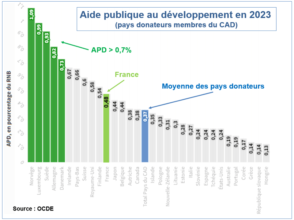En 2023, les Etats-Unis et l’Allemagne, les deux premiers contributeurs, fournissent 46% de l’APD apportée par les membres du CAD. Cinq pays (Norvège, Luxembourg, Allemagne, Suède et Danemark) dépassent 0,7%. Avec une APD représentant 0,48% de son revenu national, la France arrive au onzième rang des donateurs.
