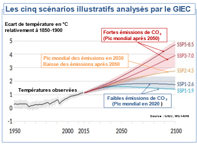 Le sixième rapport d’évaluation du GIEC regroupe les scénarios climatiques en trois familles suivant les trajectoires futures d’émission. Compte tenu du stock de gaz à effet de serre déjà rejeté dans l’atmosphère, les scénarios avec des réductions rapides d’émission ne se traduisent qu’avec des délais sur la température moyenne. Dans tous les cas, un réchauffement de l’ordre de 1,5°C devrait être atteint aux alentours de 2030.