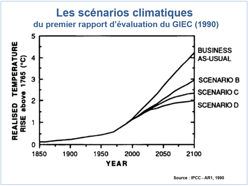 Dès son premier rapport d’évaluation (1990), le GIEC a introduit des scénarios climatiques qui sont des représentations stylisées du futur. Le scénario tendanciel, dénommé « business as usual », conduisait à un réchauffement d’un peu plus de 4°C en 2100 relativement à l’ère préindustrielle. Trois variantes B, C, D étaient proposées, avec un freinage des émissions permettant de limiter le réchauffement dans une fourchette de 2 à 3°C à ce même horizon (voir graphique ci-dessus).